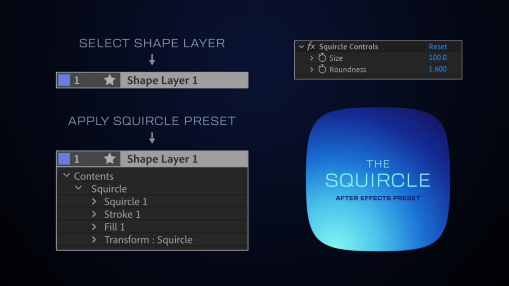 The Squircle is an After Effects preset that applies a controllable Squircle shape to your selected shape layer. It also creates a pseudo effect with parameters to change the size and roundness of the squircle.
